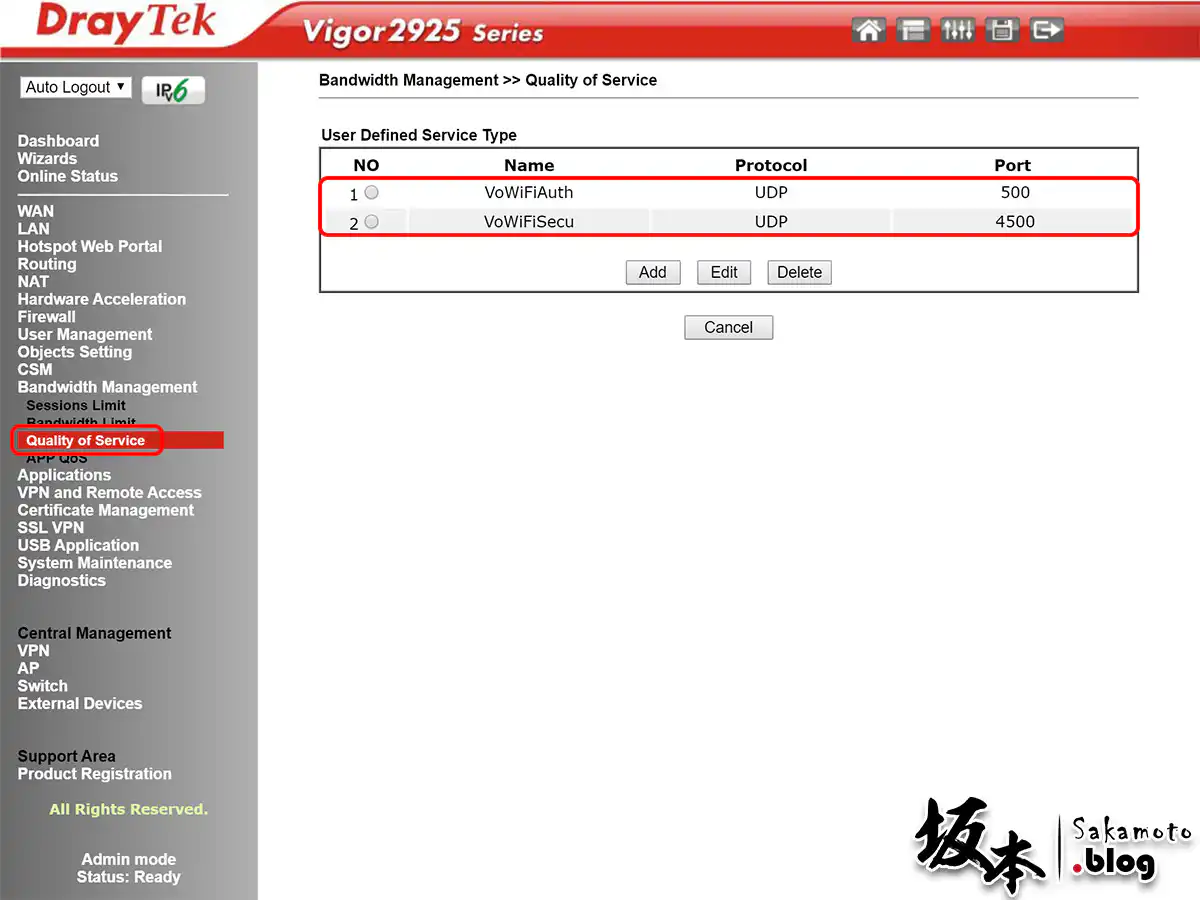 在 Bandwidth Management → Quality of Service 頁面,同樣是加入 UDP 500、4500 Port 並且套用