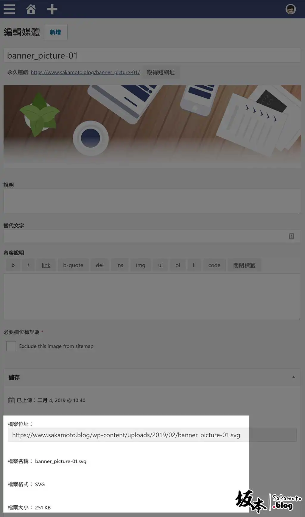 由於沒有特別什麼設置,只要在媒體庫新增檔案即可以順利上傳,也能分辦瀏覽 SVG 顯示圖片。