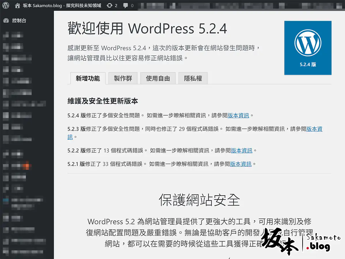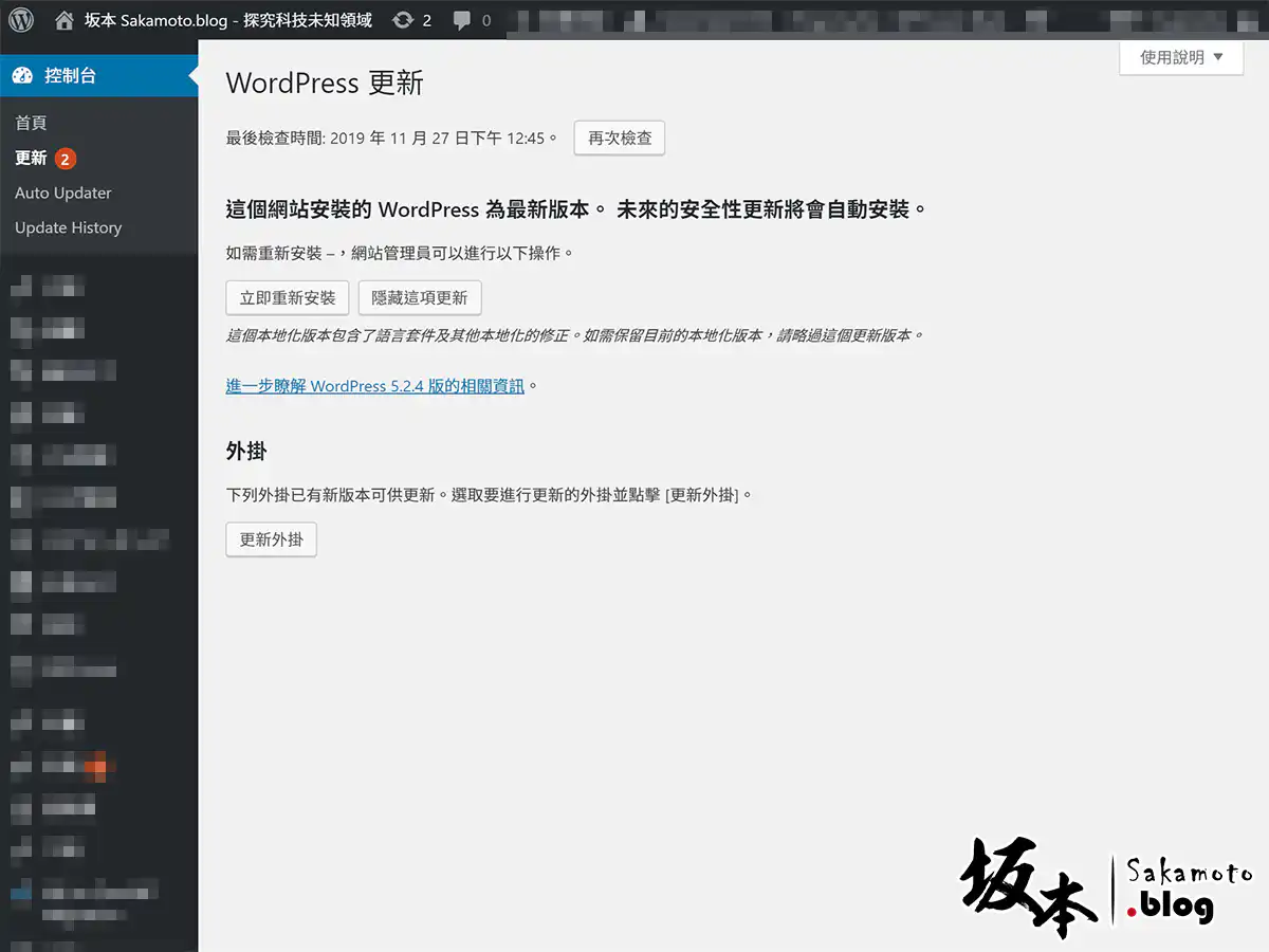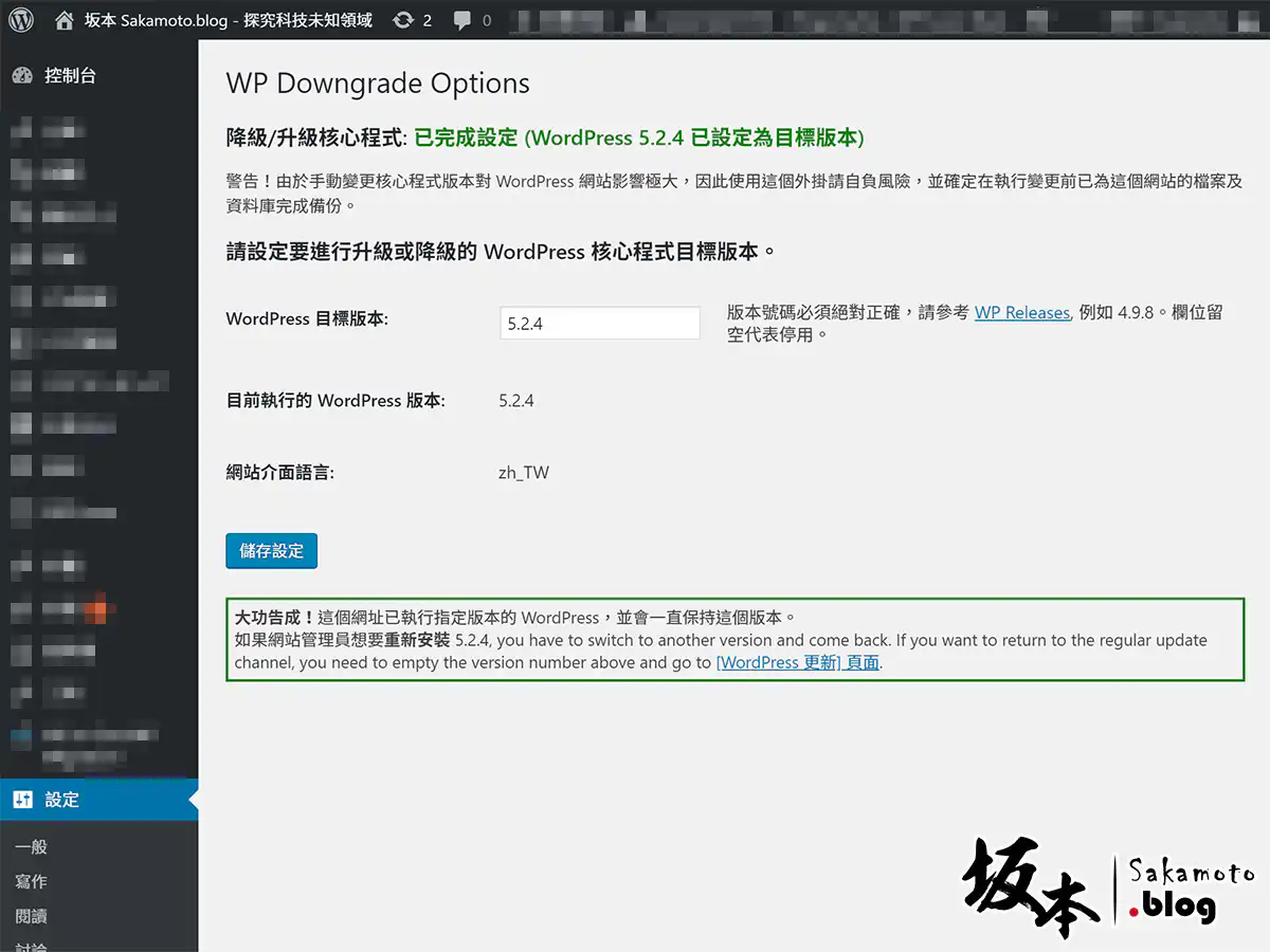 然後回到 WordPress 更新 頁面,就可以看到指定的目標版本,那麼一來可降級了。